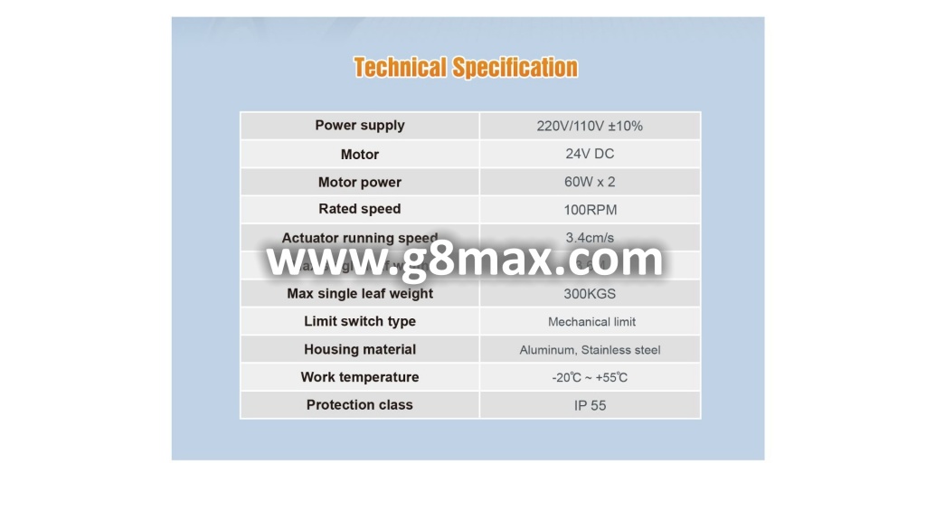 24V dobbeltportautomatikken er designet for porter med en enkeltportbredde på opptil 3,6 m / 300 kg / med en kraftig motor og slitesterk konstruksjon, og sikrer jevn og stillegående drift.